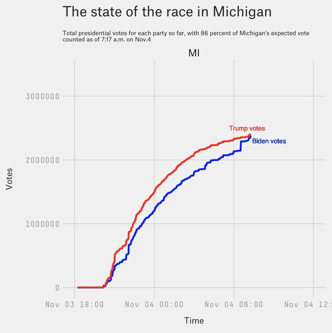 мы же про величину ступеньки, да? просто на "плохом" графике "Мичиган, около 6 утра:" видно (выше там человек запостил), что у Трампа тоже были ступеньки. по величине где-то в половину "ступеньки Байдена".